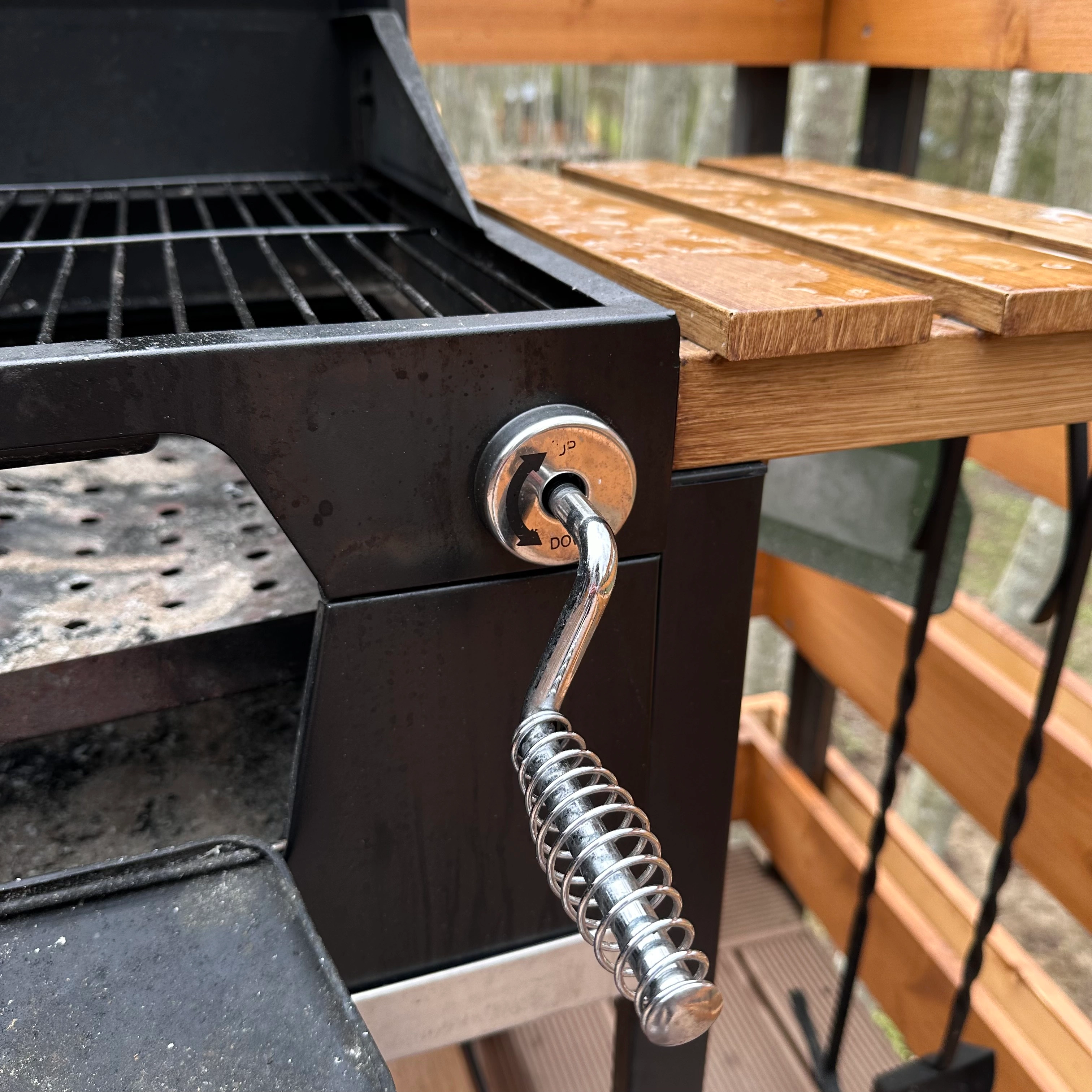 - На гриле есть специальная ручка, позволяющая поднимать и опускать поддон с углями: