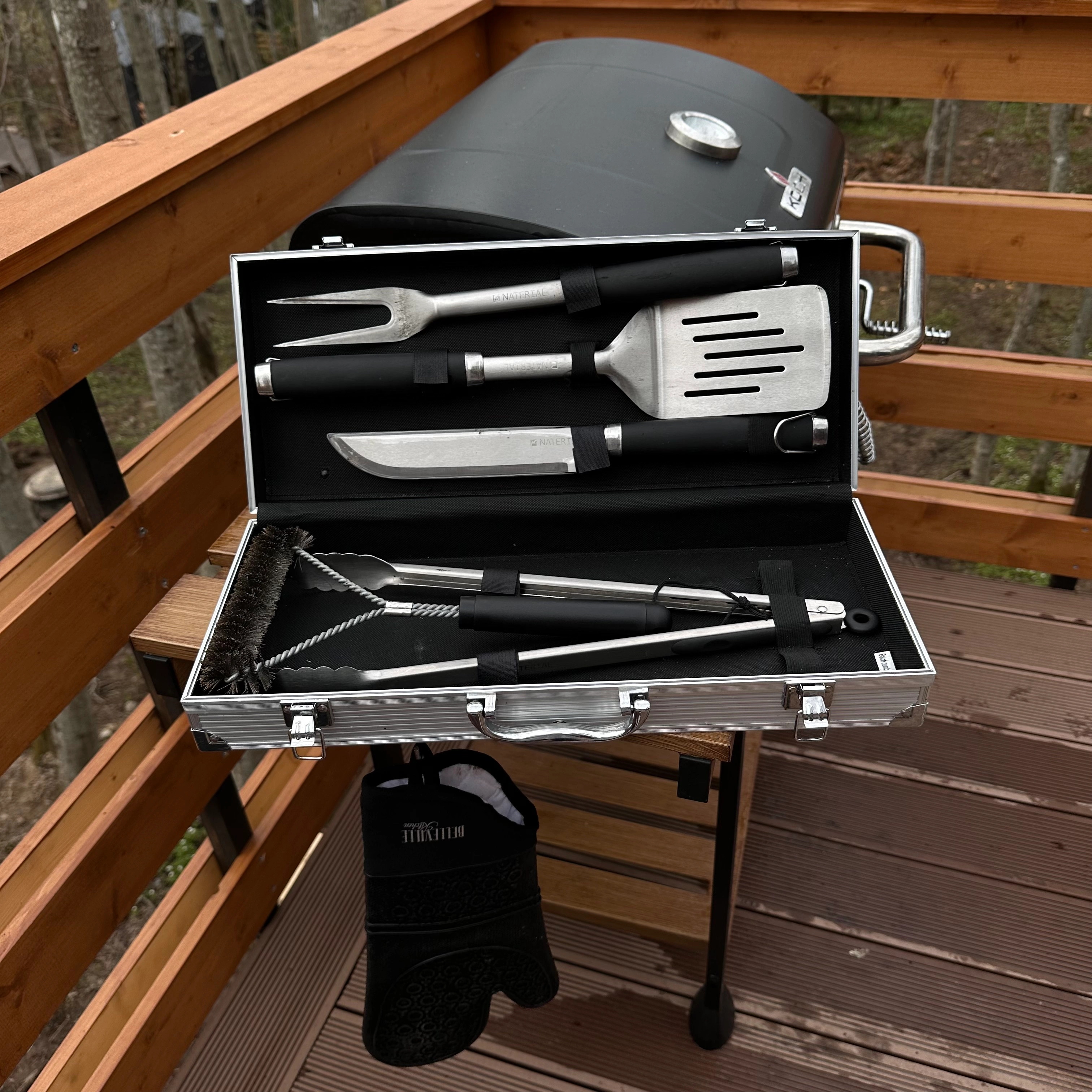 Кроме самого гриля со встроенной решеткой в мы предоставляем гостям щипцы, вилку, лопатку, нож для мяса и щетку для чистки.