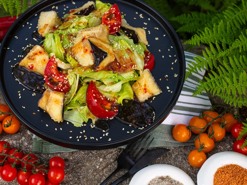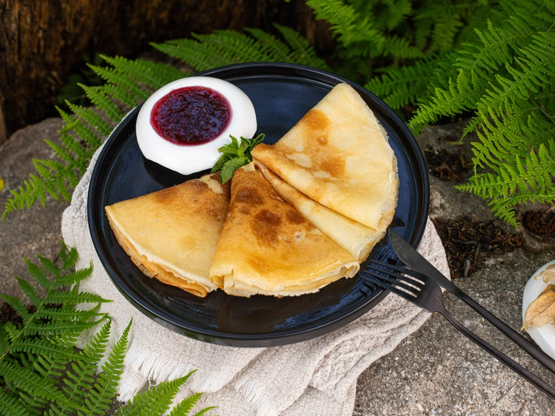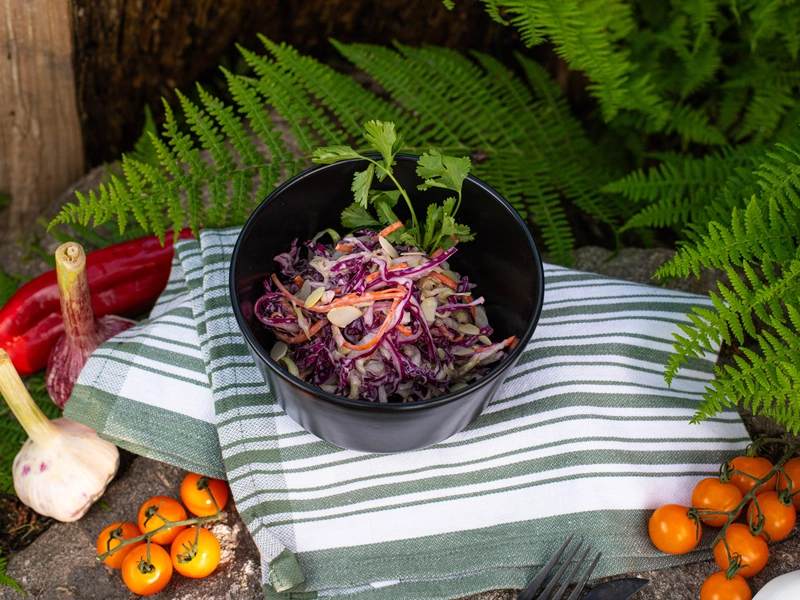 Салат коул-слоу, блинчики 2 шт., сыр, скрэмбл, бекон гриль, горячий напиток на выбор