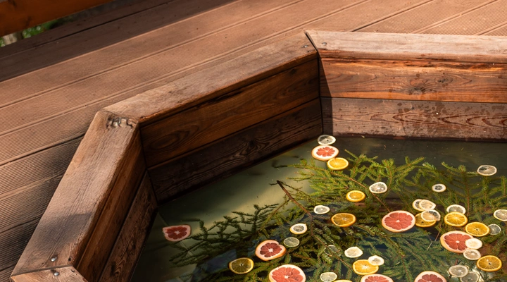 Яркие круги апельсина и лимона плавают среди свежих еловых веток: цитрус будит, хвоя уравновешивает. Один вдох — солнечный витамин-шот, один выдох — тихая тайга. После сеанса тело заряжено, голова пустая, а кожа пахнет зимним лесом, где кто-то разлил лимонад